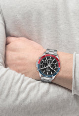 - Black chronograph dial with a stainless steel case and bracelet for a sleek, timeless look