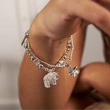 Embrace timeless elegance with this exquisite ChloBo bracelet, featuring a delicate hamsa hand charm adorned with shimmering moon-cut sparkle detailing. Crafted in lustrous silver, this piece combines spiritual symbolism with refined craftsmanship, making it an ideal accessory for layering or wearing solo. The dainty design ensures comfortable everyday wear whilst maintaining a sophisticated presence on the wrist. A meaningful addition to any jewellery collection.