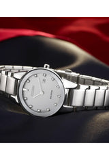 Designed with a stainless steel bracelet and a white dial, this watch combines durability with a refined look for everyday wear and special occasions.