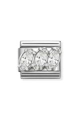 Enhance your jewellery collection with this refined composable silver charm, featuring a trilogy of sparkling cubic zirconia stones. Its elegant design offers a timeless accent that adds depth and brilliance to any bracelet, making it an exquisite choice for sophisticated personalisation. Crafted with attention to detail, this charm pairs classic style with modern charm.