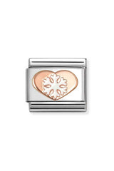 The Nomination Composable Rose Gold 'Snowflake Heart' Charm combines the delicate beauty of a snowflake with the warmth of a heart, all elegantly crafted in rose gold. Its intricate design offers a refined and graceful touch, perfect for adding a meaningful, sophisticated accent to your jewellery collection.