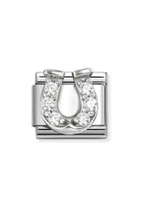 The Nomination Composable Silver CZ Horseshoe Charm combines polished sterling silver with glittering cubic zirconia accents, creating a symbol of luck with refined elegance. Its composable design offers effortless customization, making it a sophisticated addition to elevate any personalized bracelet.