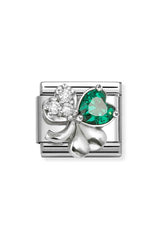 Elevate your charm collection with the Nomination Composable Silver, Green & CZ Clover Charm. Crafted in sterling silver, this exquisite piece features a silver leaf, a green clover leaf with a contrasting sparkling cubic zirconia leaf, symbolising luck and elegance. Its refined design allows seamless integration into any composable bracelet, perfect for adding a subtle yet sophisticated touch to your jewellery.