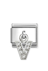 Refine your accessory collection with the Nomination Composable Silver Initial 'V' CZ Drop Charm. Crafted from premium silver, this charm is adorned with a sparkling cubic zirconia, lending a discreet yet elegant brilliance. Its versatile design integrates smoothly with other charms, making it an ideal choice for sophisticated personalization and timeless style.