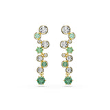 The Swarovski Constella drop earrings are 18k gold-plated designs set with green Swarovski Zirconia and clear crystals in mixed cuts, arranged in a cascading drop formation using a combination of prong and bezel settings to create layered light and colour variation.