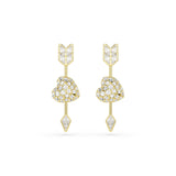 Swarovski Idyllia drop earrings in White. Gold-tone plated drop earrings featuring a heart-and-arrow motif with a reversible design, displaying clear crystal detailing on one side and a contrasting pink finish on the reverse.