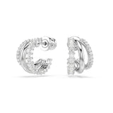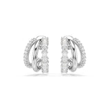 Swarovski Hyperbola mini hoop earrings in White. Rhodium-plated mini hoop earrings featuring a triple-hoop design on each ear, set with round- and square-cut Cubic Zirconia in a prong setting.