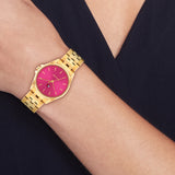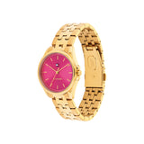 Elevate your style with the Tommy Hilfiger Ladies Gold Plated Jade Bracelet Watch. Featuring a bold pink dial, this timepiece blends refined elegance with contemporary design with a gold-plated bracelet,, offering durability and a luxurious finish. Perfect for both everyday wear and special occasions, this watch combines precision craftsmanship with timeless appeal.