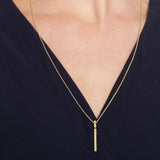 - Design: Linear bar pendant on a long necklace for a contemporary silhouette